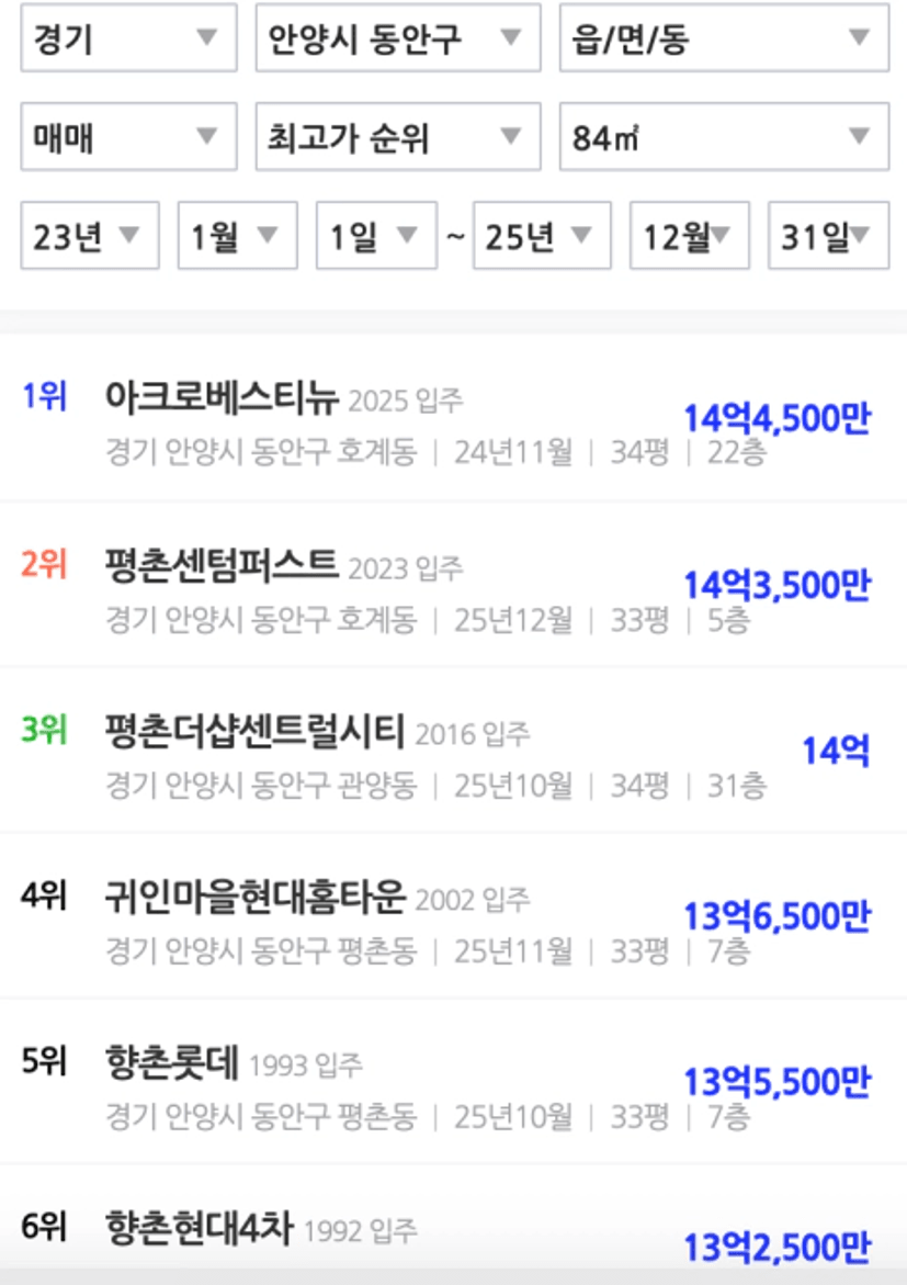 안양시 동안구 중 평촌 생활권은 입지가 매우 좋다. 만약 이곳이 광명 철산처럼 모두 신축밭으로 바뀌었다면 철산보다 더 비쌀 것이다. 과천의 80%이상 가격은 받는 지역일 것이다. 하지만 평촌의 알짜 땅들은 대부분 용적률이 높고, 대지지분이 적은 구축 단지들로 구성되어 있다. 아마 재건축은 좀 어려울듯 하다.
