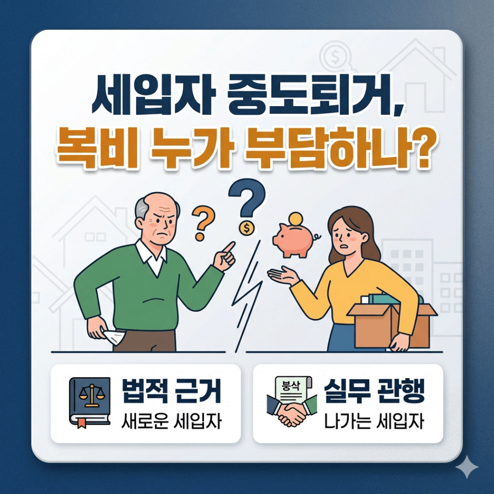 * 실무: 실무적으로는 ‘기존 세입자’가 부담하는 경우가 많습니다. 그 근거는 두 가지인데요.
