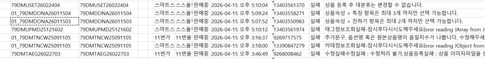 스스판매자가 아닌 유플랫 프로그램에서 속성작업을 수정해주셔야합니다. 대분류의 경우는 삭제 후 재등록이 필요합니다. 태그정보조회실패와 카테정보조회실패는 추후에 재등록하시면 되실꺼에요ㅎ
