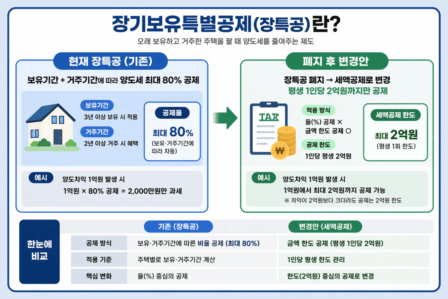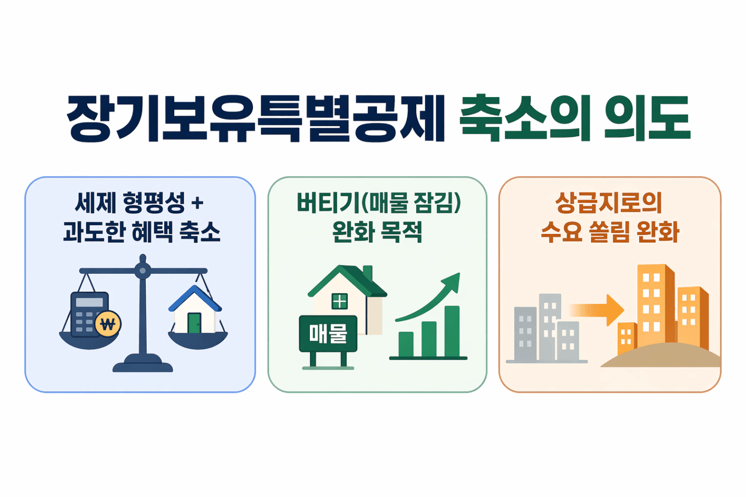 | 1주택 | 양도소득세 (장특공) | 장특공 대폭 축소 (평생 2억 한도) | 고가 주택 매도 시 세금 급증, 이사 어려움, 매물 잠김 |