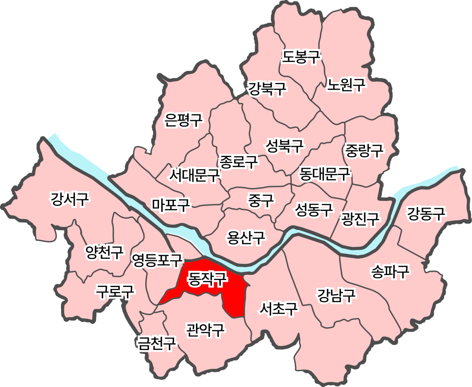 동작구는 서울 남서쪽, 한강 바로 아래에 위치한 자치구예요.