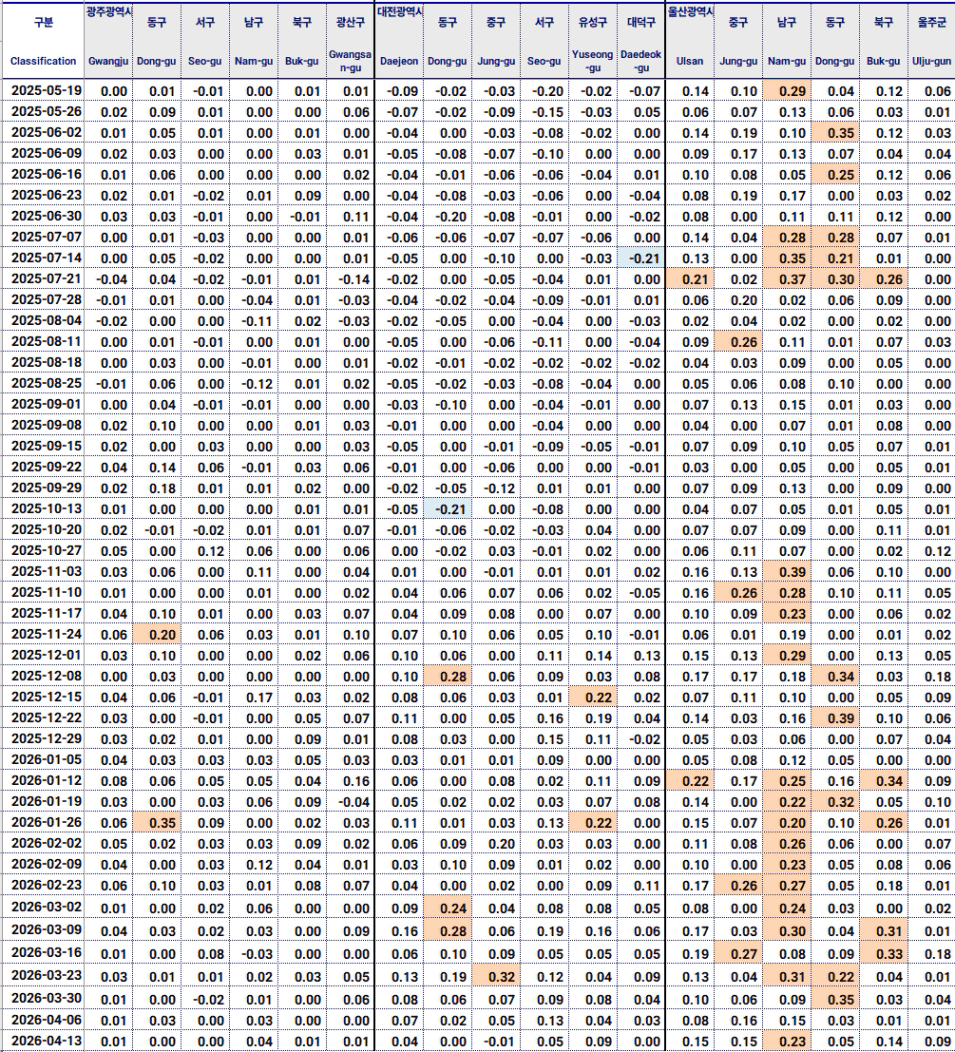 울산은 남구, 중구, 북구의 상승세가 눈에 띕니다.