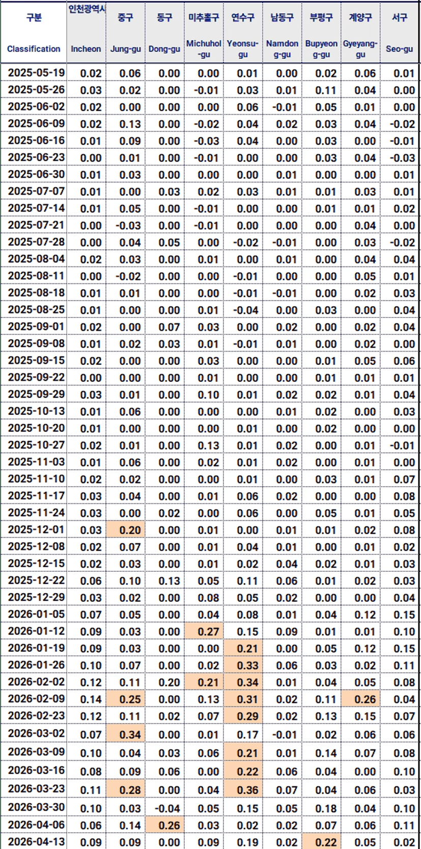 인천 매매가 증감률은 0.01%로