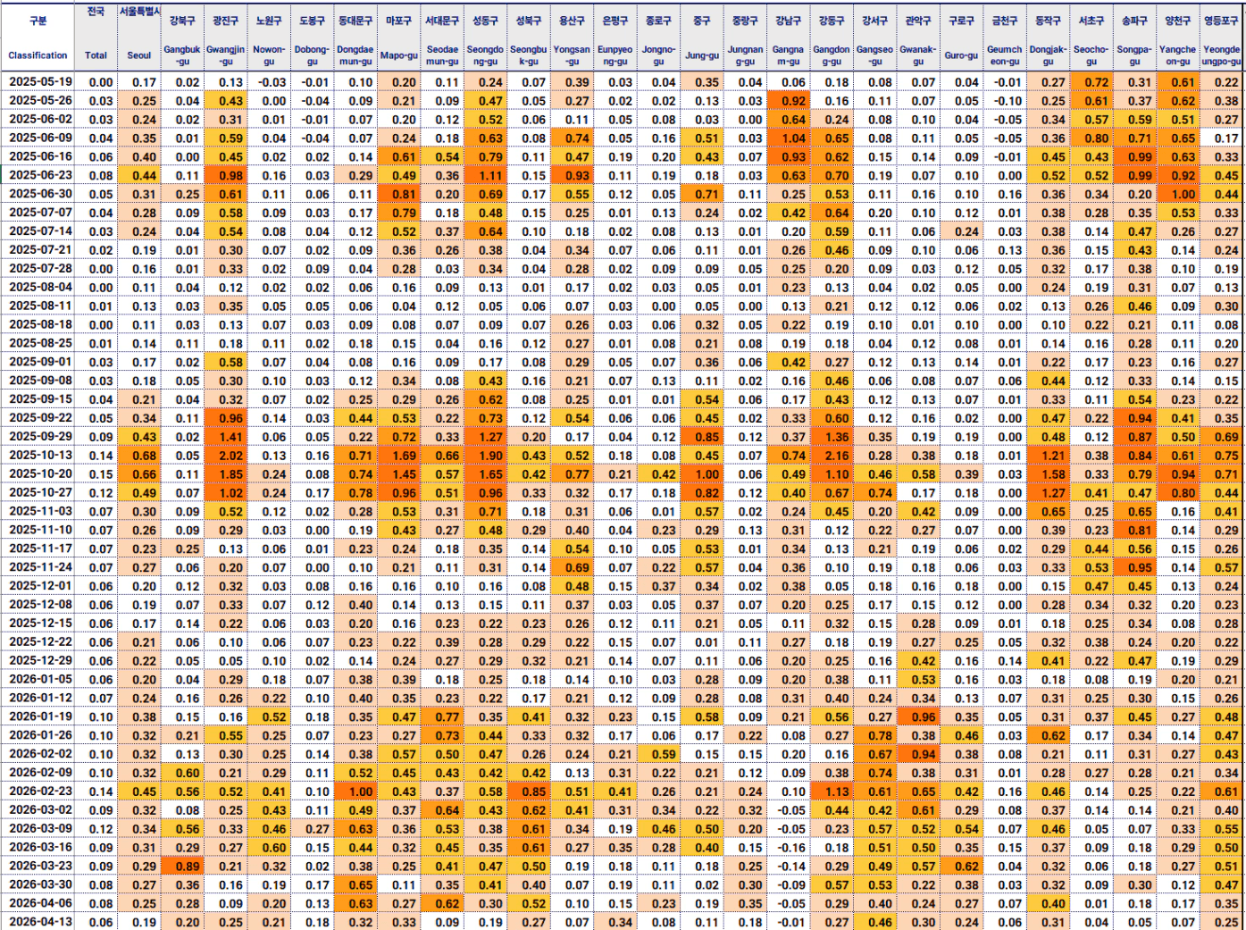 서울의 경우 강서구, 은평구, 마포구, 동대문구, 동작구