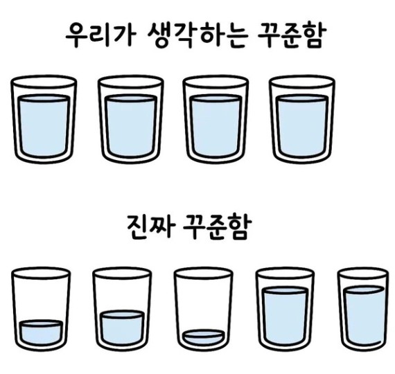 그럼에도 늦은 시간까지 야근을 하거나, 체력적인 이유로 잠들어버리는 날도 있었습니다. 그럴 때는 ‘어제 못한 만큼 오늘 하면 된다, 평일에 부족했던 만큼 주말에 보완하면 된다’는 마음으로 부담을 내려놓고, 장기적으로 지속하는 것에 집중하고 있습니다. 아래 사진의 ‘진짜 꾸준한’ 모습처럼요 🙂