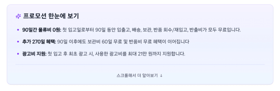 첫 입고 후 90일간 입출고비, 배송비, 보관비, 반품비가 전부 무료예요.