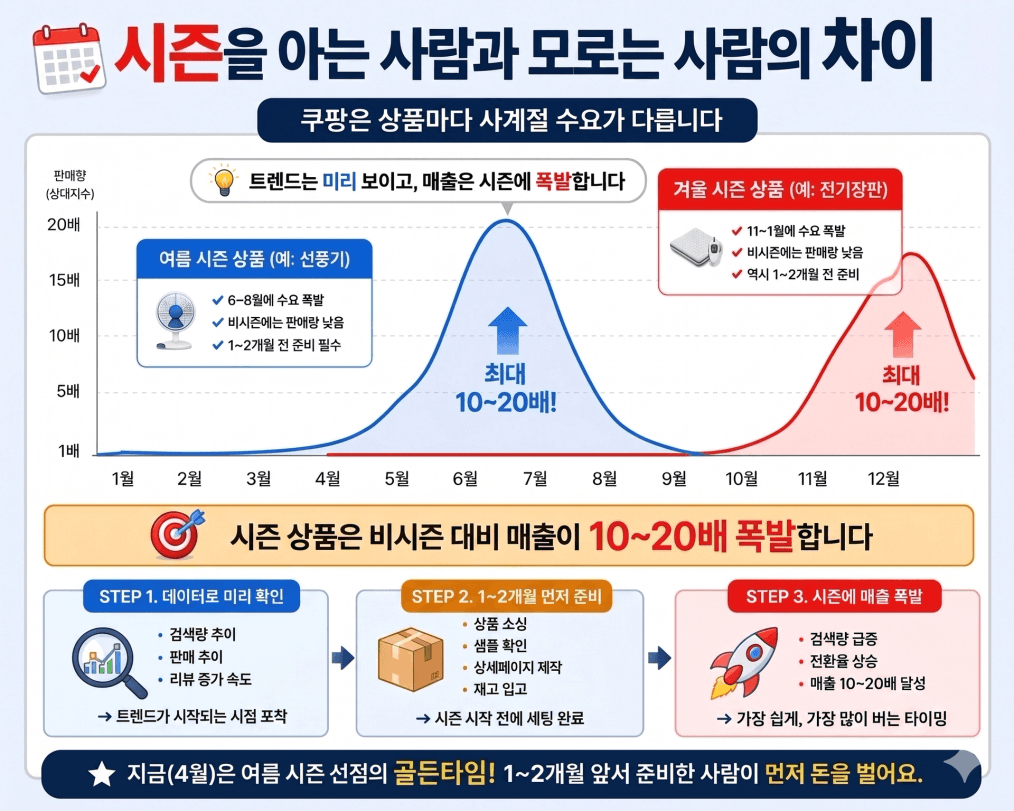 쿠팡 시즌 상품은 1~2개월 선행이 기본이에요. 이것만 알아도 매출이 엄청나게 달라져요.