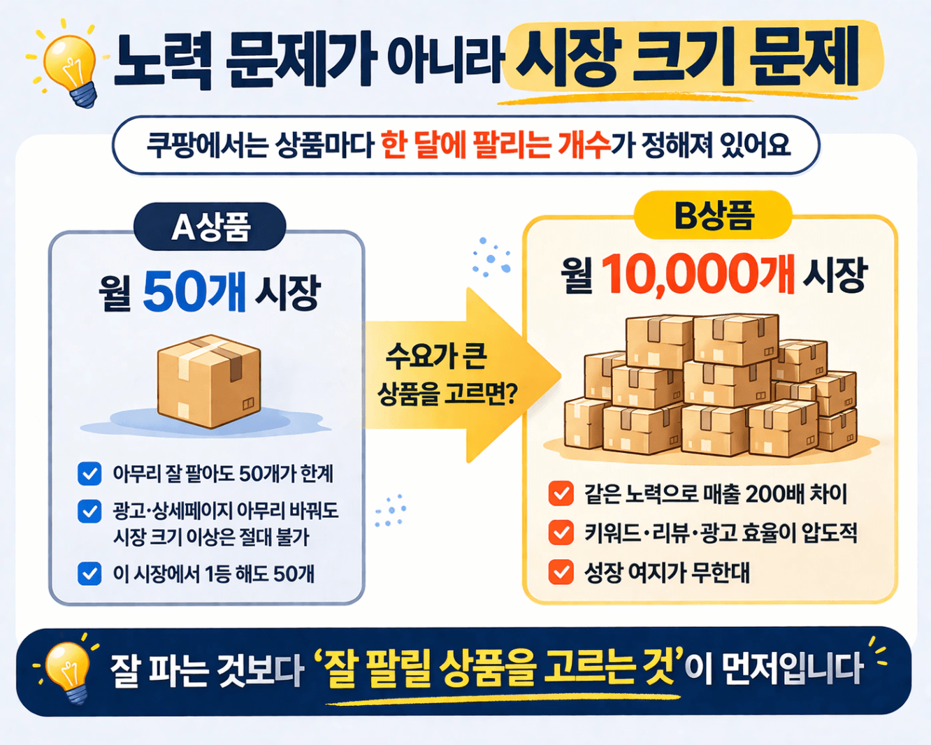 그래서 쿠팡에서는 '잘 파는 것'보다 '잘 팔릴 상품을 고르는 것'이 먼저예요.