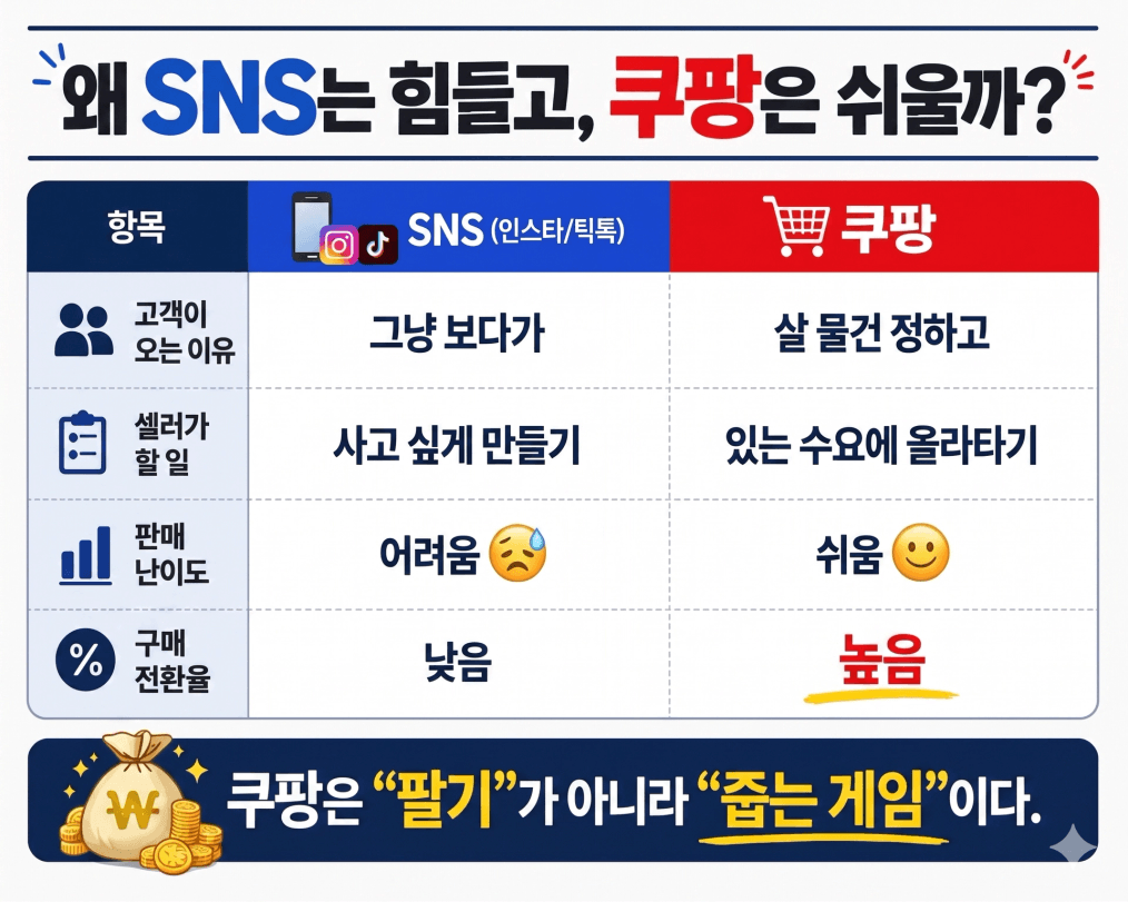 이 차이 때문에 쿠팡은 구매 전환율이 SNS랑 비교도 안 되게 높아요.