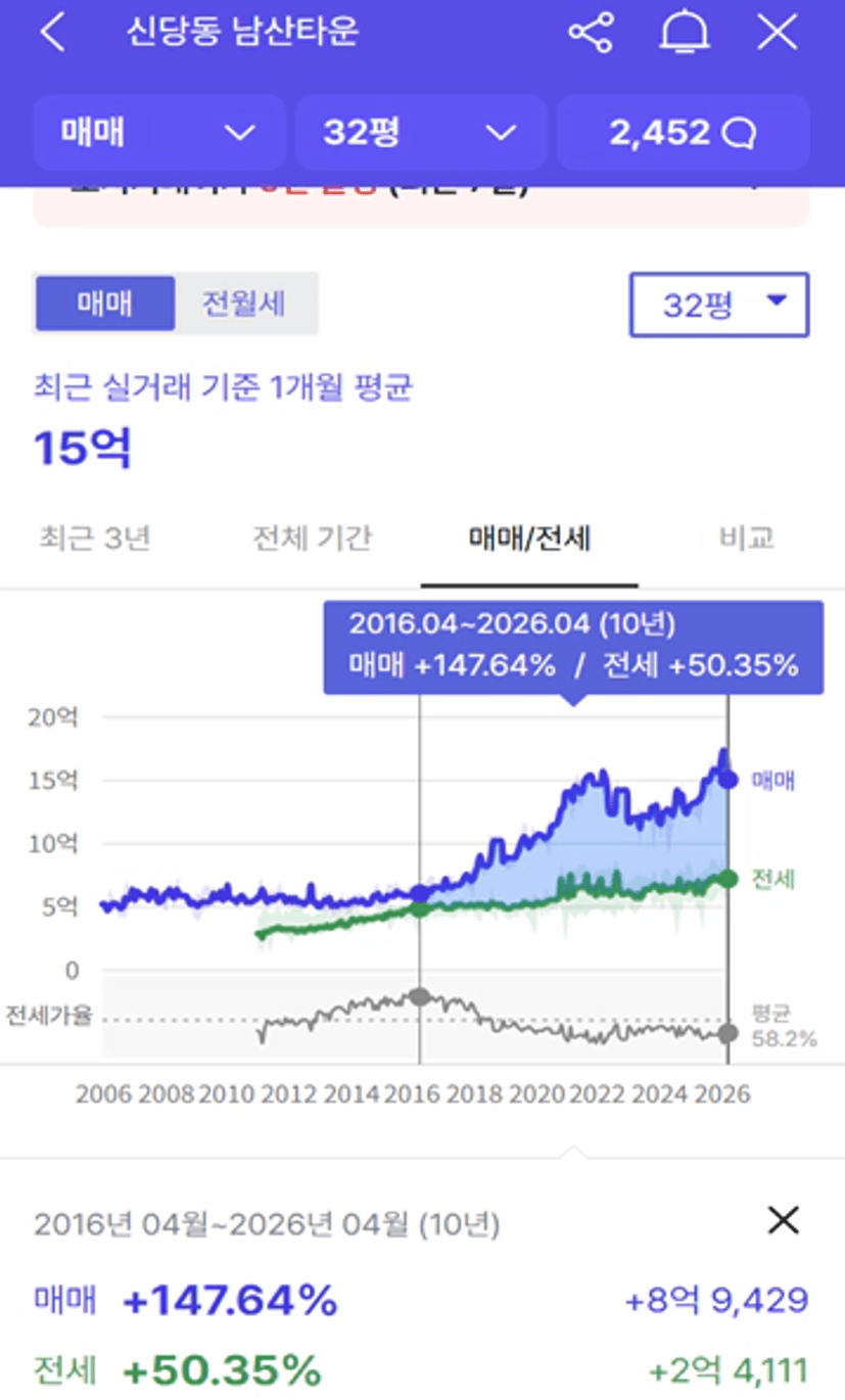 현재, 서울 중위아파트 가격이 12억임을 감안하여 대략 15억 정도의 시세를 형성하고 있는 남산타운 33”을 예시로 들어보겠다.