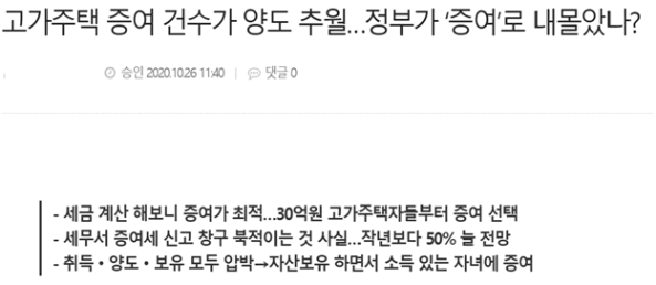 실제로, 세부담이 큰 경우 고가주택의 경우는 양도세를 내느니 증여를 선택하여 자녀에게 부를 이전하고자 하는 현상들이 발생할 수밖에 없을 것이다.