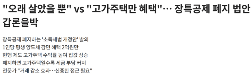 지난 4월 8일, 양도소득세의 장기보유특별공제(장특공제)를 폐지하는 내용의 법안이 발의되면서 찬반 의견이 엇갈리고 있다.