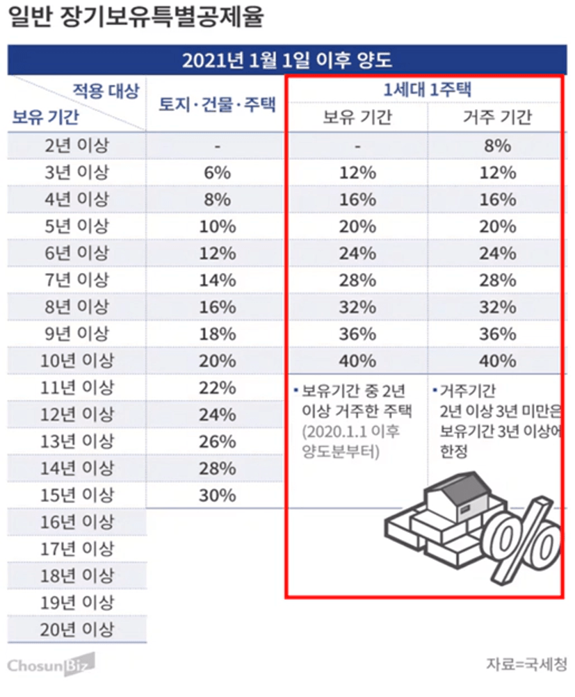 단, '2년 이상 거주' 요건을 채워야만 최대 80%(10년 보유 + 10년 거주 충족시) 혜택을 받을 수 있는 구조로 되어 있다(빨간색 박스 참조).