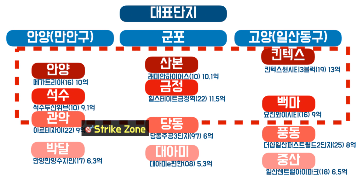 국평기준 대장가격은 안양의 귀인마을현대홈타운(14억) > 고양 킨텍스원시티3(12.5억) > 군포 힐스금정(11.5억) 순입니다.