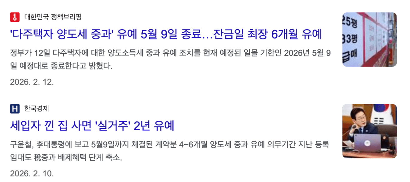 그러던 중, 2026년 5월 9일 양도소득세 중과 유예 종료에 대한 기사가 스멀스멀 나오며, 2월 초 시장에 변곡점이 생깁니다.