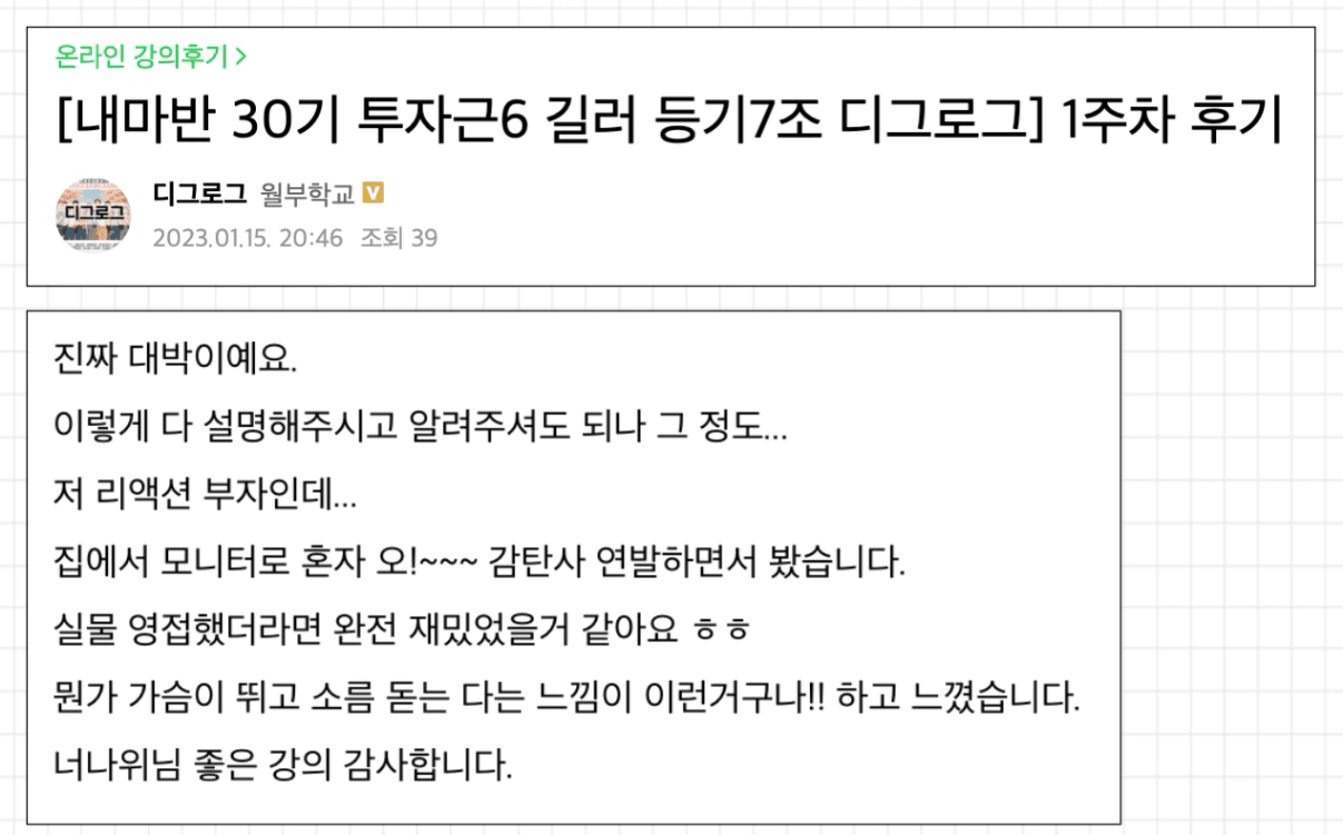 그럼에도 불구하고, 정말 잘한 점이 있었다면 강의에서 배운대로 혼자 임장을 다니며, ‘매매가가 더 싼 단지를 찾아서 경기도로 넘어가볼까?' 라는 생각을 가지고 있던차 저보다 경험 많으셨던 내집마련 기초반 조원분들의 강력한 추천으로 열반스쿨 기초반까지 수강을 결심한 점 입니다. 열반스쿨 기초반에는 무려 너나위님의 선생님이셨던 너바나님의 강의가 포함되어 있었고, ‘이왕 강의 듣기 시작한 거 너바나님 강의 한번은 들어봐야되지 않겠어요?’ 하는 한마디에 설득되어, 지금은 그렇게 저를 투자의 세계로 인도해주셨던 조원분들과 조장님께 엄청 감사하고 있습니다.