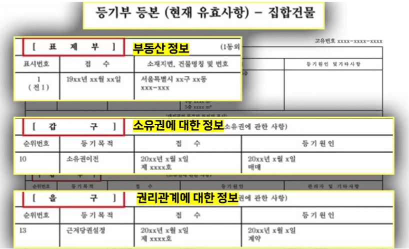 표제부, 갑구, 을구로 나뉘어 있는 등기부등본