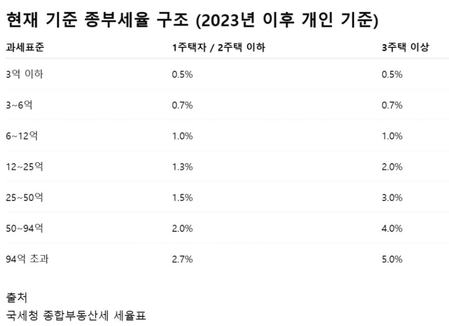 다만 대부분의 경우 종부세 부담 여부를 결정하는 가장 중요한 기준은 세율 자체보다는 기본공제 기준을 초과하는지 여부입니다.