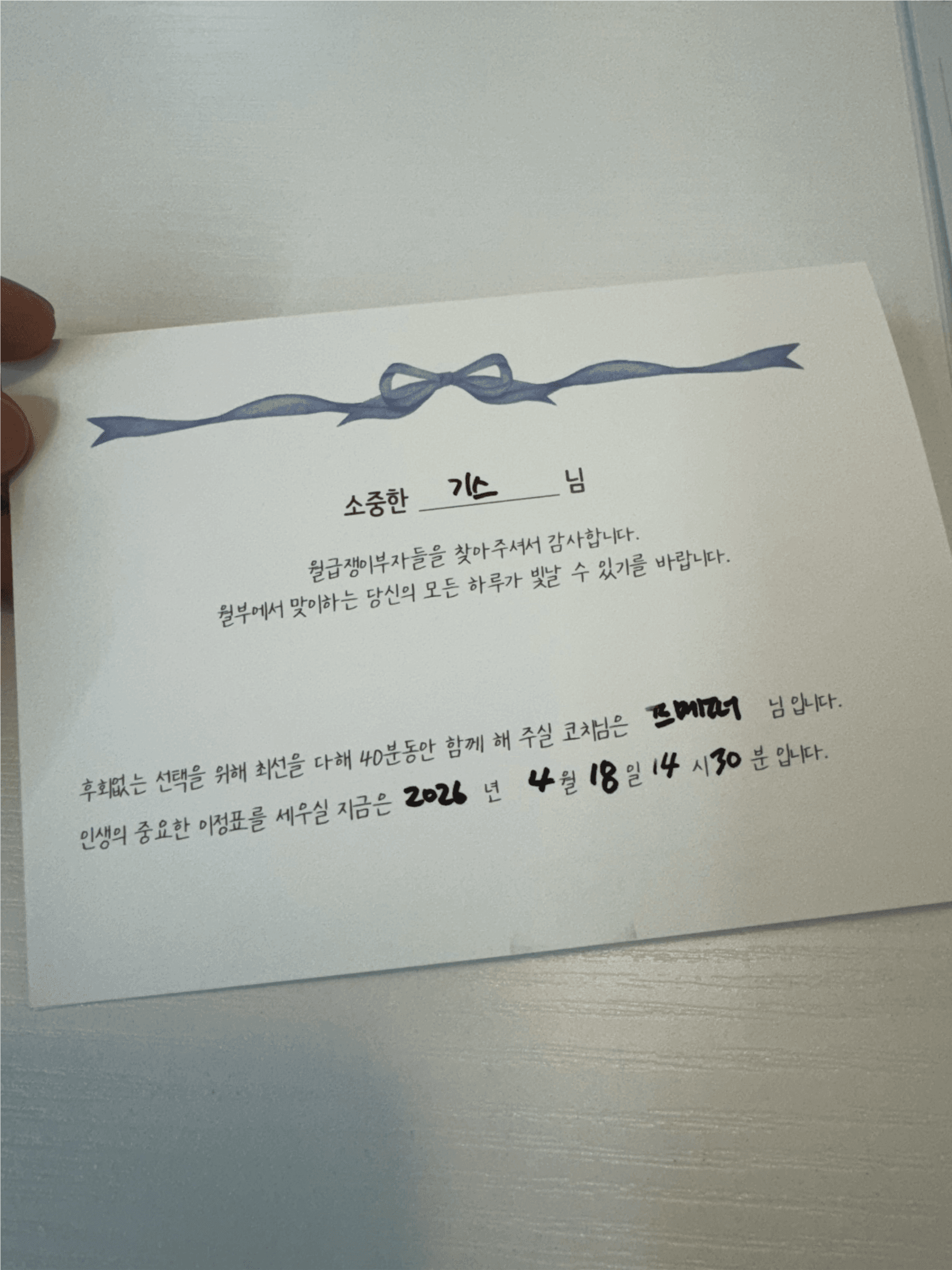 늦지 않게 사옥에 도착해서 소피님의 친절한 안내를 받아 따뜻한 문구가 담긴 카드를 받아들고 투코를 기대하면서 대기할 수 있었어요🤭