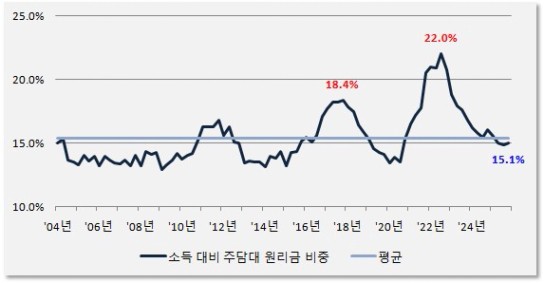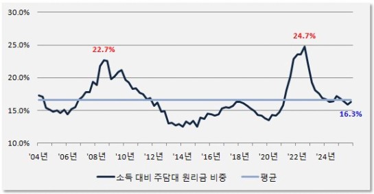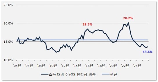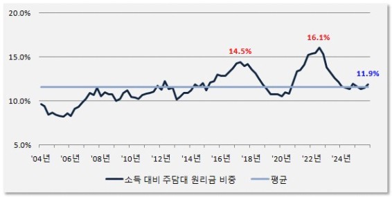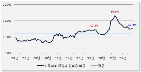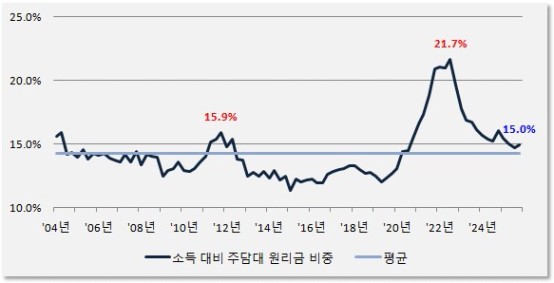 주택구입부담지수에 대한 쉬운 이해를 돕기 위해 실제 지수 대신 "소득 대비 주택담보대출 원리금 상환 비중"으로 그래프를 바꿔 그렸습니다.
