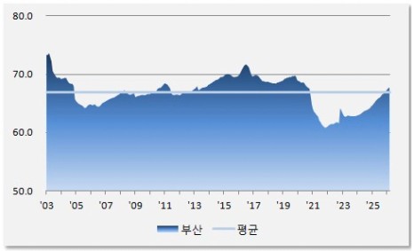 2026년 3월 전세가율은 67.7%로 중장기 평균 66.9% 比 1.01배 수준입니다. 그래프에서 보시다시피 2021년 11월(60.8%) 바닥을 찍고 꾸준히 상승 중입니다. 이는 부산의 공급 부족 상황이 지속되고 있음을 의미하고 있습니다.