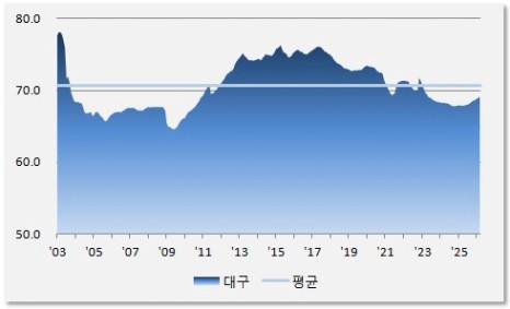 2026년 3월 전세가율은 69.1%로 중장기 평균 70.7% 比 0.98배 수준입니다. 긴 시간 동안 하락하던 대구의 전세가율은 2025년 4월을 바닥으로 조금씩 상승으로 방향을 틀고 있습니다. 대구도 공급 감소 상황을 체감하기 시작한 셈입니다.