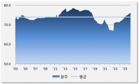 2026년 3월 전세가율은 76.2%로 중장기 평균 74.0% 比 1.03배 수준입니다. 광주는 주택구입부담지수는 높은 편이나 전세가율은 가파르게 상승 중입니다. 중장기 평균을 넘어선 이후도 상승폭이 가파른 상황으로, 전세가가 매매가를 자극시키는 상황으로 가고 있다고 볼 수 있습니다.