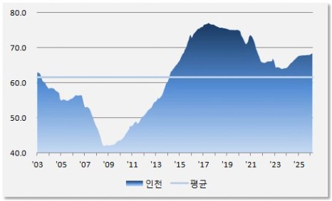 2026년 3월 전세가율은 68.5%로 중장기 평균 61.6% 比 1.11배 수준입니다. 인천은 과공급 구간을 지나오면서도 전세가율이 견조한 추세를 유지하면서 중장기 평균 대비 상당히 높은 수준을 보여주고 있습니다.
