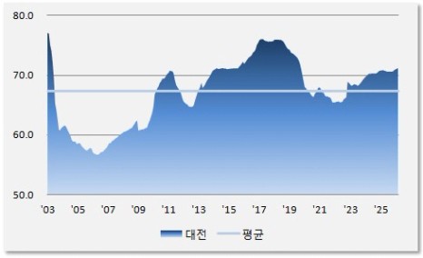 대전의 2025년 4분기 주택구입부담지수는 59.8로, 이는 대전의 중간소득 가구가 대전의 중간가격 주택을 구입할 때 소득의 15.0%를 주택담보대출 원리금 상환에 사용하는 수준을 의미합니다. 이는 전고점(2011년 4분기) 15.9% 比 0.94배 수준이며, 중장기 평균 14.3% 比 1.04배 수준입니다.