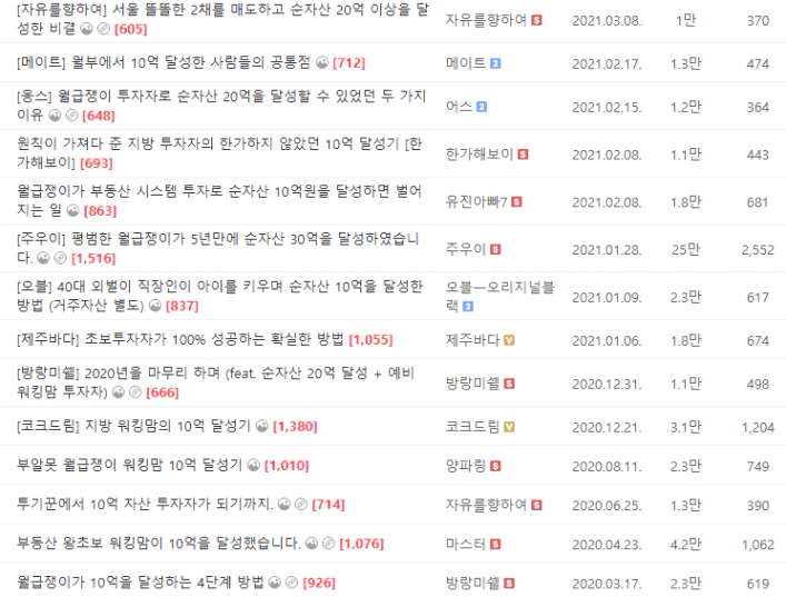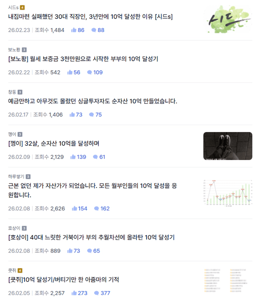 월부 커뮤니티 [10억달성기] 게시판 에서 나와 비슷한 조건(나이, 거주지, 투자금 등)을 가진 분의 글을 딱 하나만 골라 끝까지 읽어보세요. 그게 여러분의 인생을 바꾸는 첫걸음이 될 거예요!