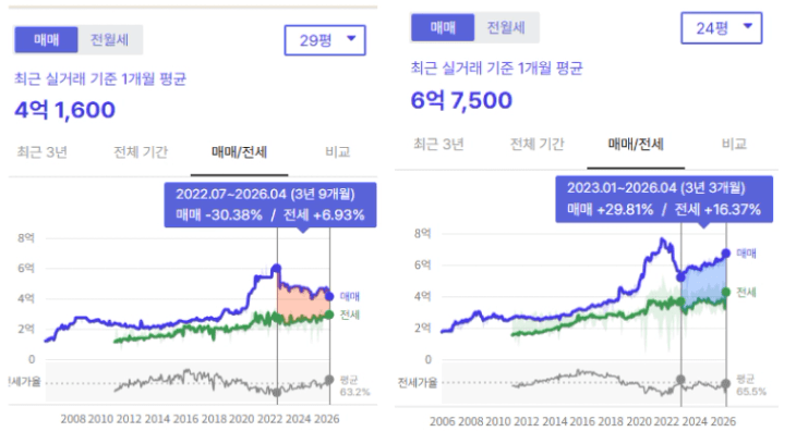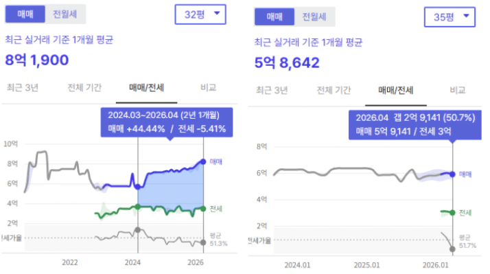 왼쪽은 44%나 상승한 대구의 신축 예시이며