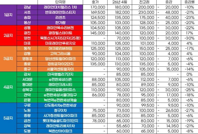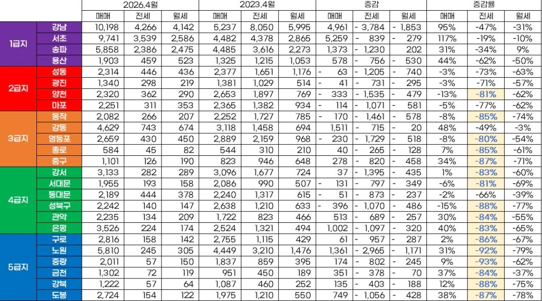 자치구별로 2023년과 비교해 보니 1급지는 감소 폭이 상대적으로 적었지만,