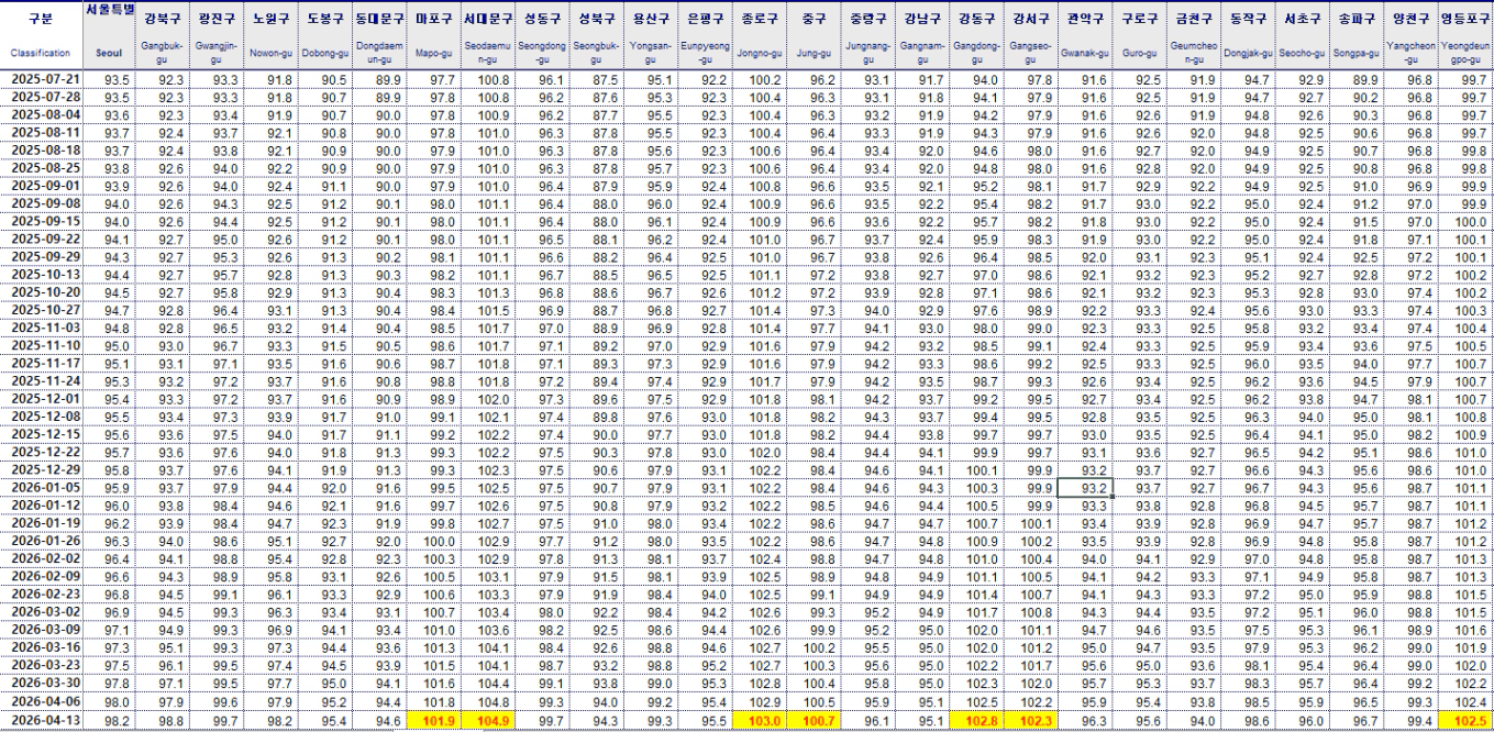 서울 25개구 중 지수 100을 넘어선 곳은 마포, 서대문, 종로, 중구, 강동, 강서, 영등포 등 7개구뿐입니다.