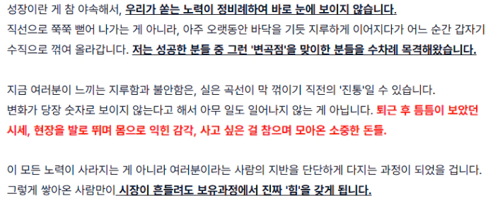 윤이나 선배님의 경우 중간중간 언급하시는 것을 보아,,, 아마도 비슷하게 역전세&하락장 시장을 겪으셨던 것으로 예상이 되고 공감이 너무 많이 갔습니다. 그럼에도 이 투자를 진행한 이유를 남기고, 믿으며, 옆에서 함께 달리는 동료들을 보면서 계속 해나가고 있으시다고 하셨습니다. 오늘 하루도 mvp 망하고, 매도 시나리오는 계속 꼬이고, 험난한 하루였던 것 같은데요. 힘든 시간들을 견디고 견뎌 씨앗을 심은 선배의 모습을 보면서 기운 내야겠습니다.