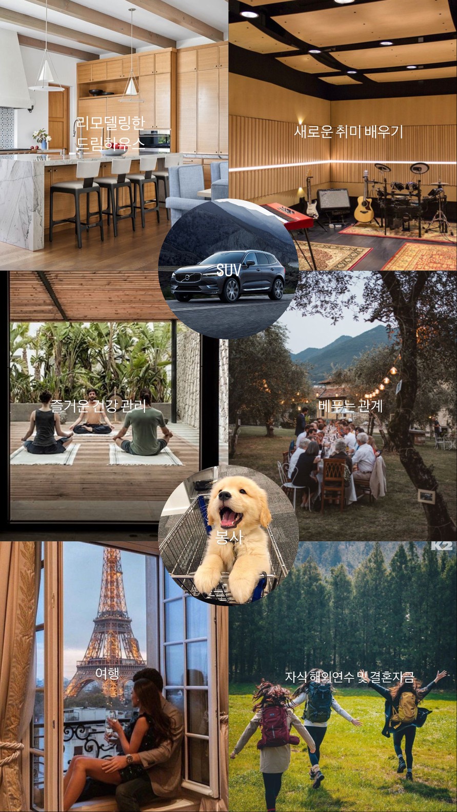 - 내 집 마련(강아지가 뛰어놀 수 있는 마당이 있는 집, 야외에서 바베큐할 수 있고 텃밭을 할 수 있는 정도의 마당이 있는 집, 우리 각자 취미방 1개씩, 애들 방 1개씩, 안방, 4가족 공용 드레스룸까지 해서 방 6개, 아파트 안에 헬스장, 골프장이 있는 집)