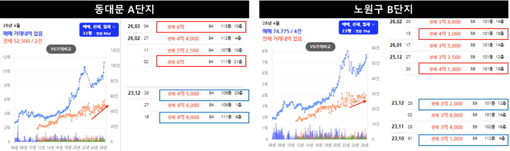 동대문 서대문권역은 4억대 전세가 6억을 넘어섰다.