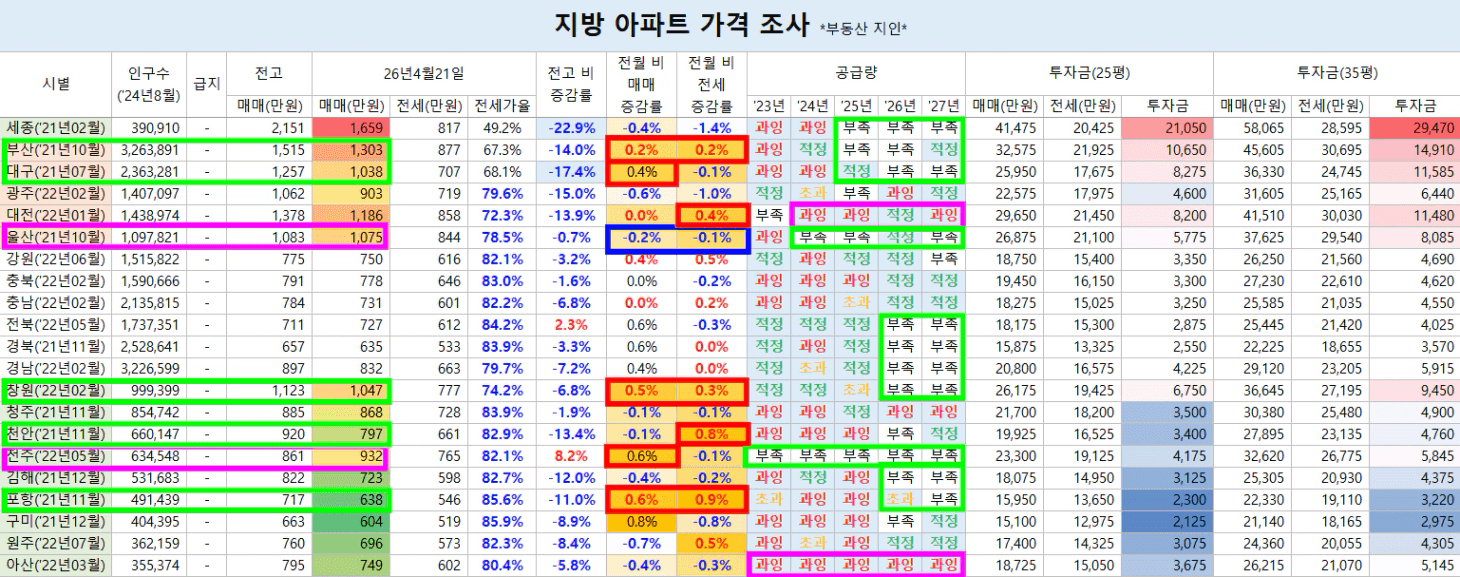 이미 공급에 의해 많이 오른 울산, 전주는 매도 계획을 수립해야 한다고 생각합니다.