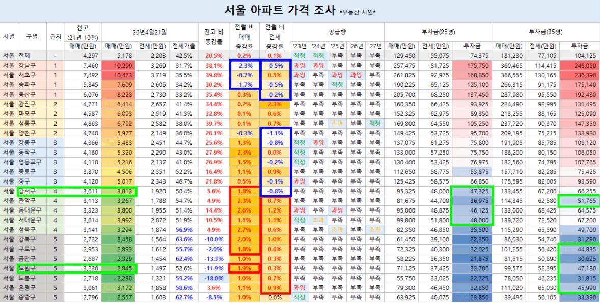 상급지 특히 강남 3구의 매매/전세 분위기가 지난달(+0.4% 수준 상승) 대비 확연하게 달라졌고 하락세로 전환되었습니다.