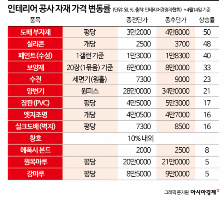 추가로 이사비 운송비 역시 가격이 올랐다고 하네요. 예산을 지나치게 초과하여 인테리어를 하는 것보다 기존의 계획을 일부 수정하여 수리 범위를 줄이는 것이 대안이 될 수도 있습니다.