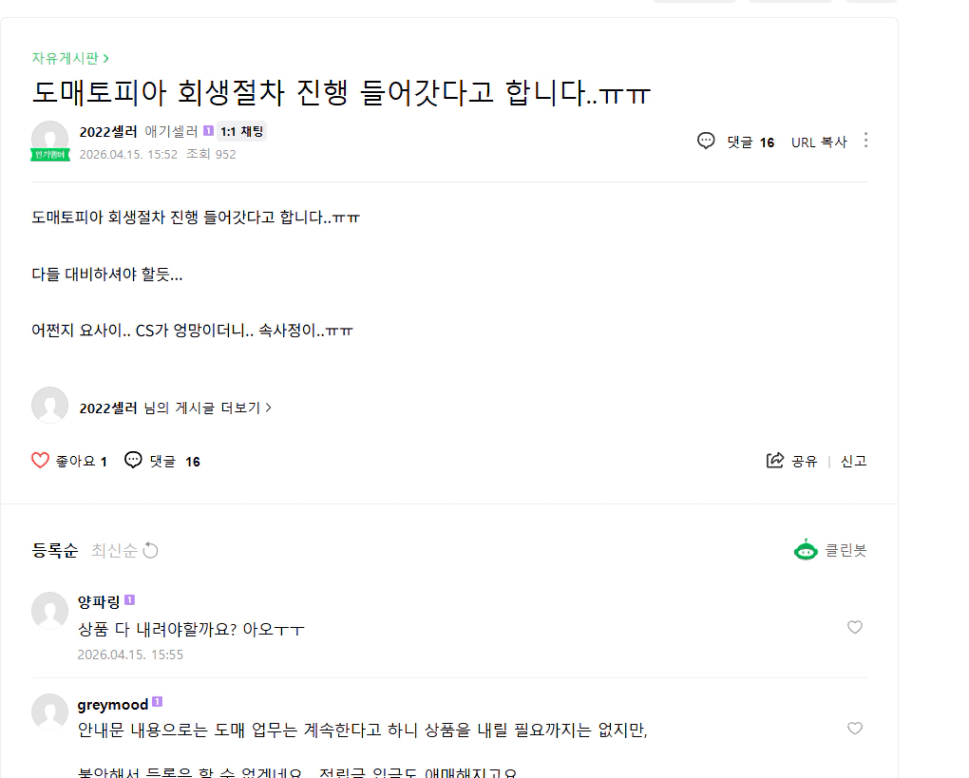 민군님 잘못은 아니지만 열심히 가공만 했는데 도매처 날라가게 생겼고
