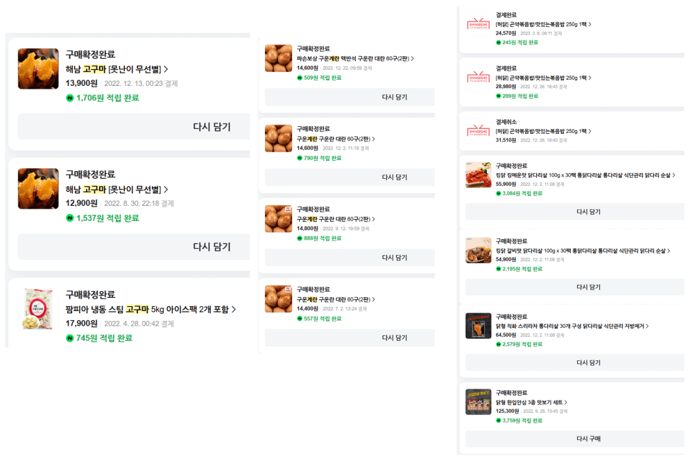월급날이 되면 못난이 고구마와 닭가슴살, 구운계란, 냉동볶음밥을