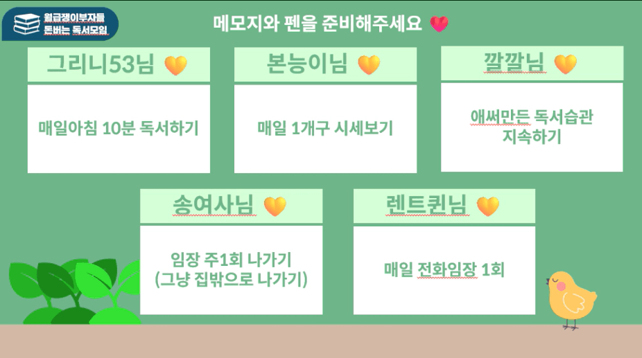 그리니님 어제도 너무 열심히 참여 잘 해주셨는데 후기까지 이렇게 정리를 잘해주셨네요..!❤️ 어제 좋은 말씀 많이 나눠주셔서 감사해요 그리니님 매일아침 독서도, 그리고 단조롭고 꾸준한 투자도 응원할게요 화이팅!! 😍