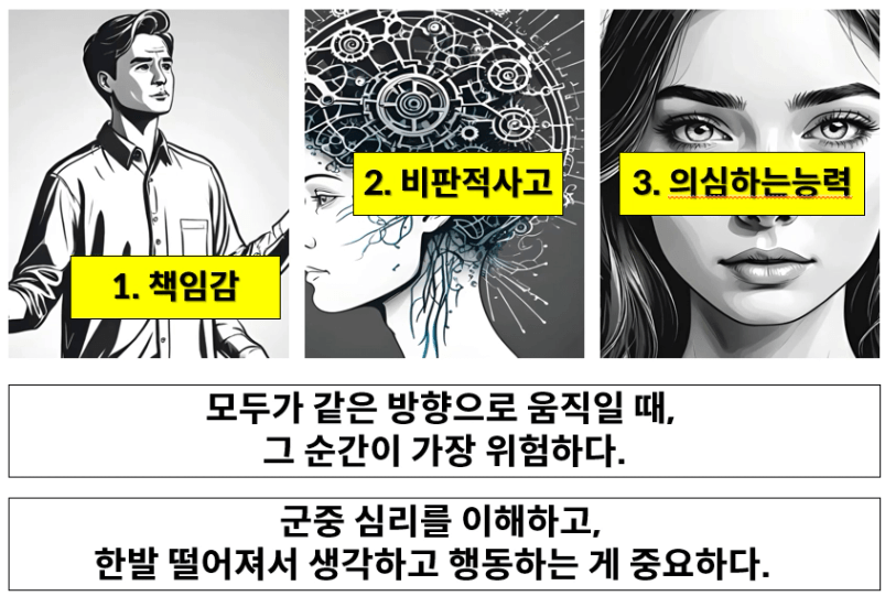 따라서 우리가 올바른 판단을 내리기 위해서는 내가 내리는 의사결정이 이처럼 군중심리에 의한 결정인지, 스스로의 판단인지를 한템포만 멈추는 연습을 해보는 것이 필요할 것 같습니다.