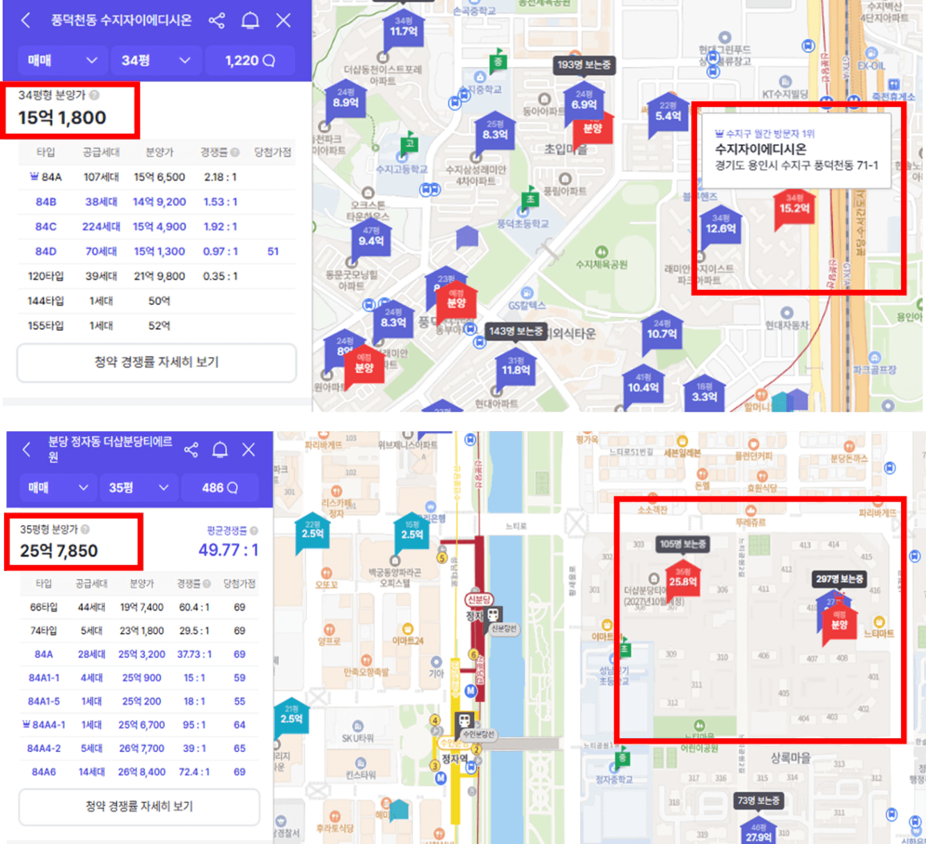 두 정거장 옆, 분당 정자동 더샵분당티에르원 25억.