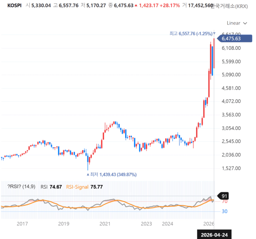 코스피가 연일 사상 최고치를 경신하고 있습니다. 시장이 과열(과매수) 구간에 접어들고 있는 것 같습니다.