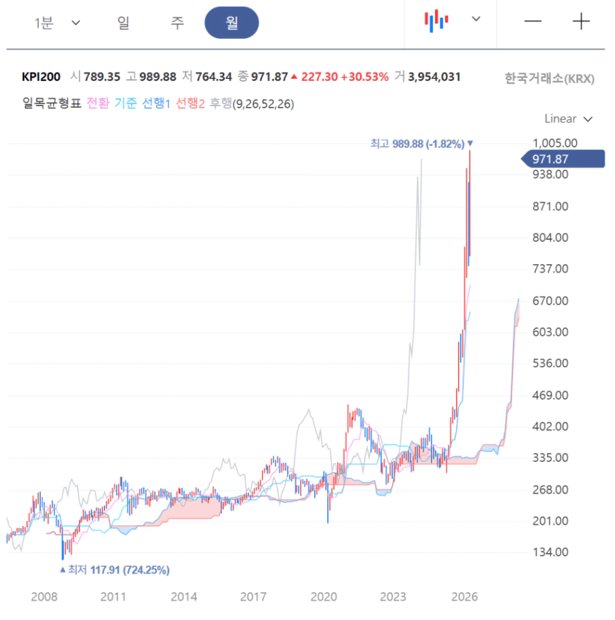 2) 코스피 200의 일목균형표로 보면 상승추세는 26년 8월까지 이어질 수 있다(코스피도 마찬가지임).