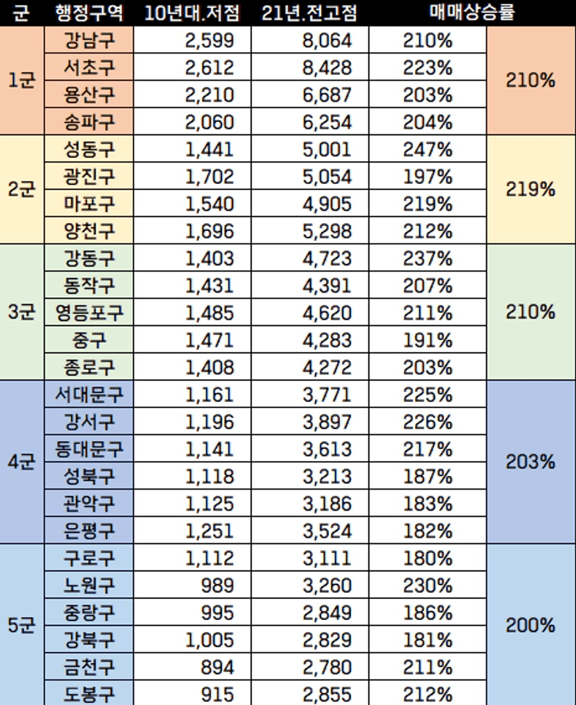 그럼 13년부터 21년까지 서울 25개구의 매매 상승은 어느정도가 되었을까요?