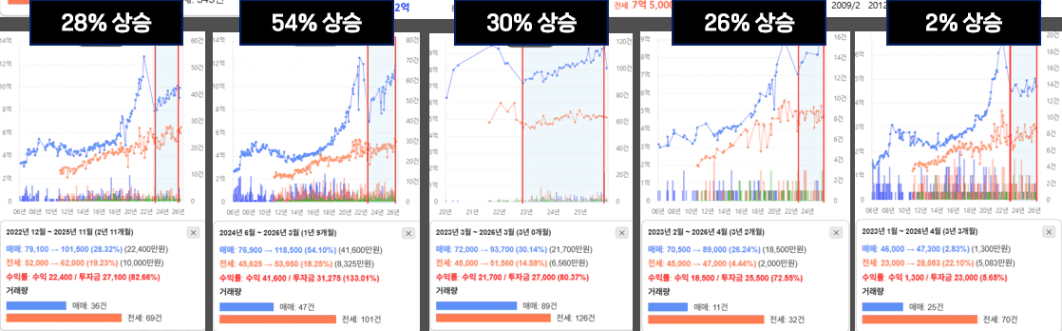 지역 내에서도 54% 가 상승한 단지도 있고, 2% 상승으로 거의 하지 않은 단지도 있고, 이게 현장입니다.
