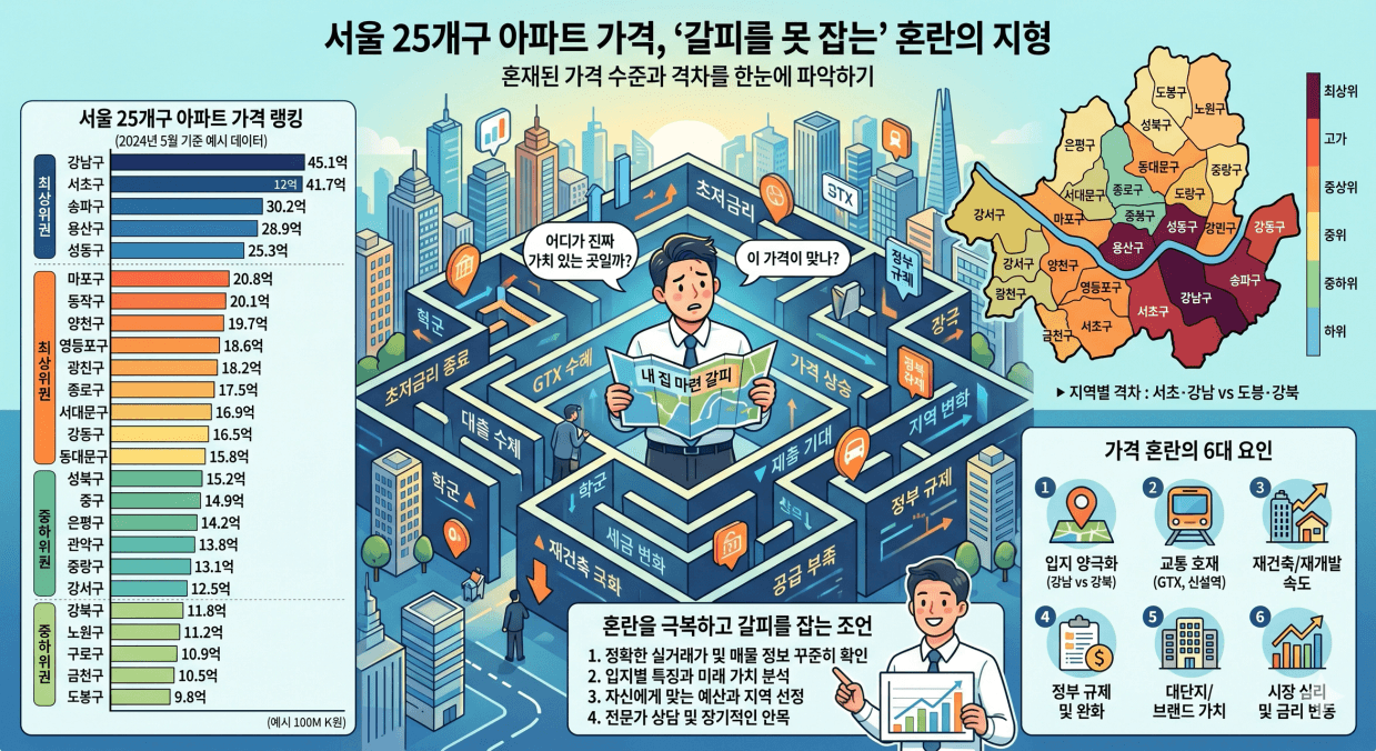 상승과 하락이라는 지역별로 서로 다른 움직임, 그리고 여러 정책과 시장의 불안정성으로 더더욱 혼란이 가중되고 있는 것 같습니다. 그래서 오늘은 서울 25개구의 과거 시장에서 가격 변화. 그리고 현재의 시점의 수준을 한번 체크해보도록 하겠습니다.
