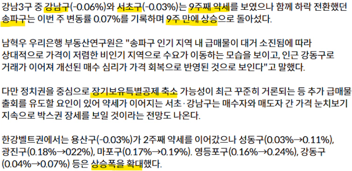 서울의 강남3구의 강남, 서초는 약세, 송파구는 상승 전환, 용산구는 약세